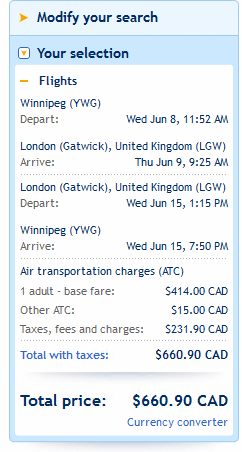 1. Go to WestJet.com and search for a flight from Winnipeg (YWG) to London Gatwick (LGW).